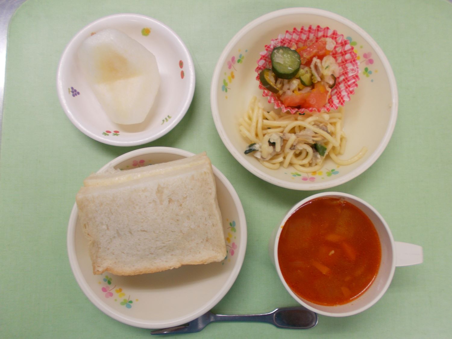 ホームきょうの給食 9/14 今日の給食 2023年9月14日 子どもたちが大好きな給食やおやつを毎日紹介しています! 【幼児食・乳児食】 昼食 バターサンド ミネストローネ スパゲティ・ボンゴレ 白菜フレンチサラダ 梨 3時のおやつ ジョア きのこ雑炊 10時のおやつ(乳児のみ) 牛乳