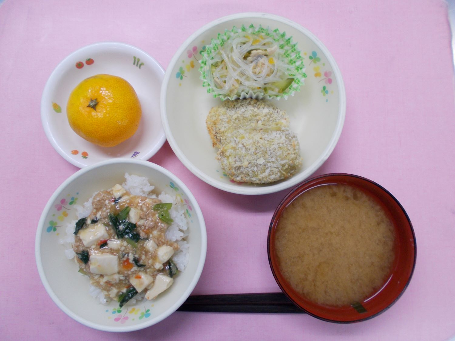 ホームきょうの給食 10/13今日の給食 2023年10月13日2023年10月16日 子どもたちが大好きな給食やおやつを毎日紹介しています! 【幼児食・乳児食】 昼食 マーボー麦丼(乳児:マーボー丼) みそ汁 さつまいもコロッケ バンサンスー みかん 3時のおやつ 牛乳 ホットケーキ 10時のおやつ(乳児のみ) 牛乳