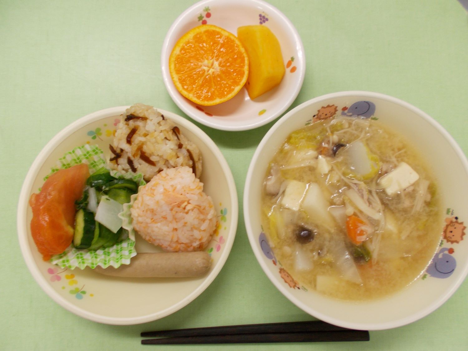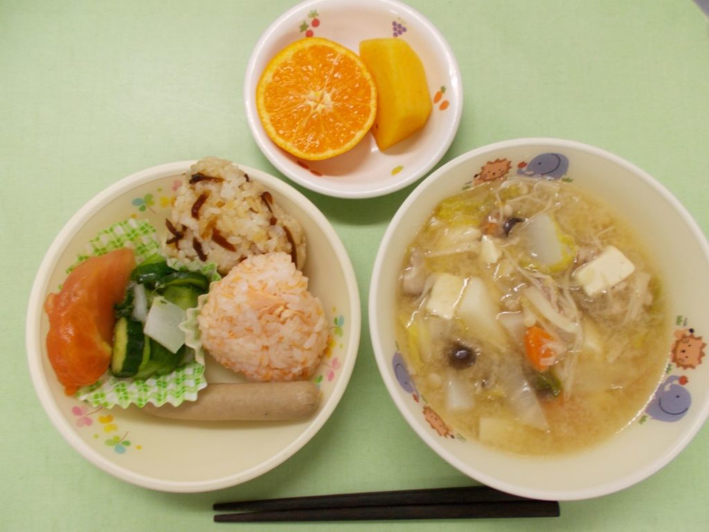 ホームきょうの給食 11/1 今日の給食 2023年11月1日 子どもたちが大好きな給食やおやつを毎日紹介しています! 【幼児食・乳児食】 昼食 おにぎり2種(鮭/昆布) →乳児:ごはん スペシャル豚汁 ボイルウインナー →乳児:焼魚 塩もみ野菜 トマト みかん・柿 3時のおやつ コーンフレークミルクがけ 10時のおやつ(乳児のみ) ジョア
