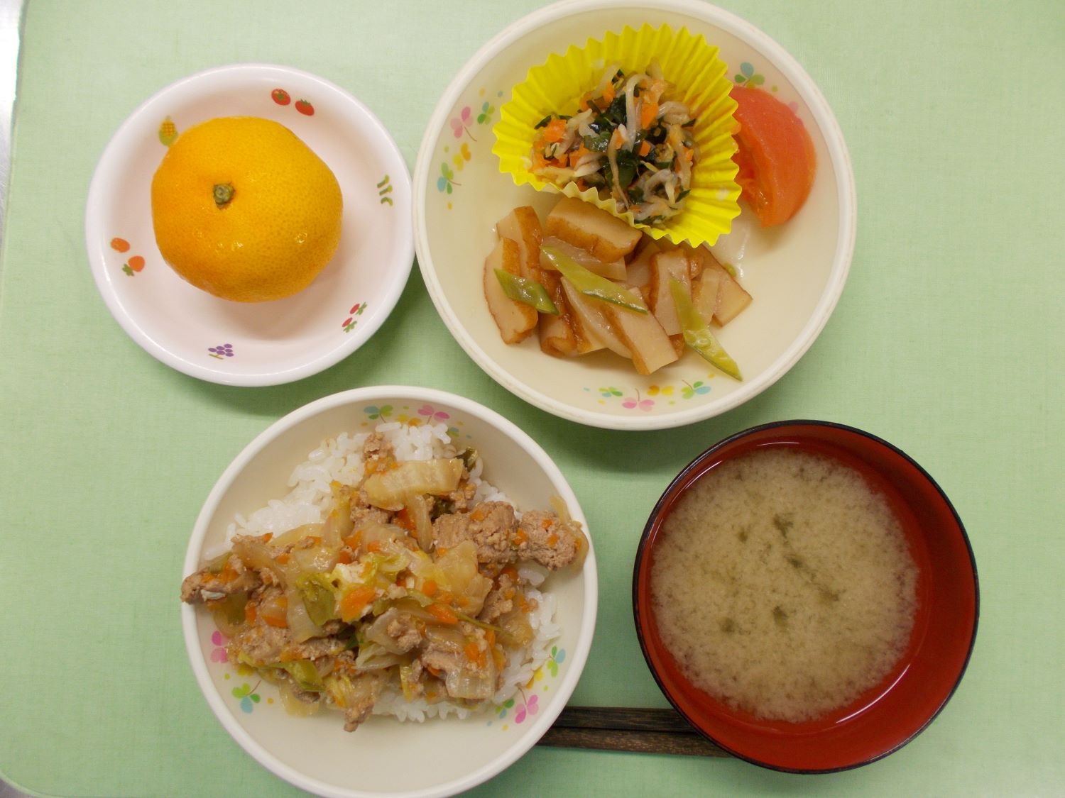 ホームきょうの給食 11/6 今日の給食 2023年11月6日 子どもたちが大好きな給食やおやつを毎日紹介しています! 【幼児食・乳児食】 昼食 豚すき麦丼 (乳:豚すき丼) みそ汁 大根とさつまあげの煮物 わかめのナムル風 トマト みかん 3時のおやつ ジョア みそ雑炊 10時のおやつ(乳児のみ) 牛乳