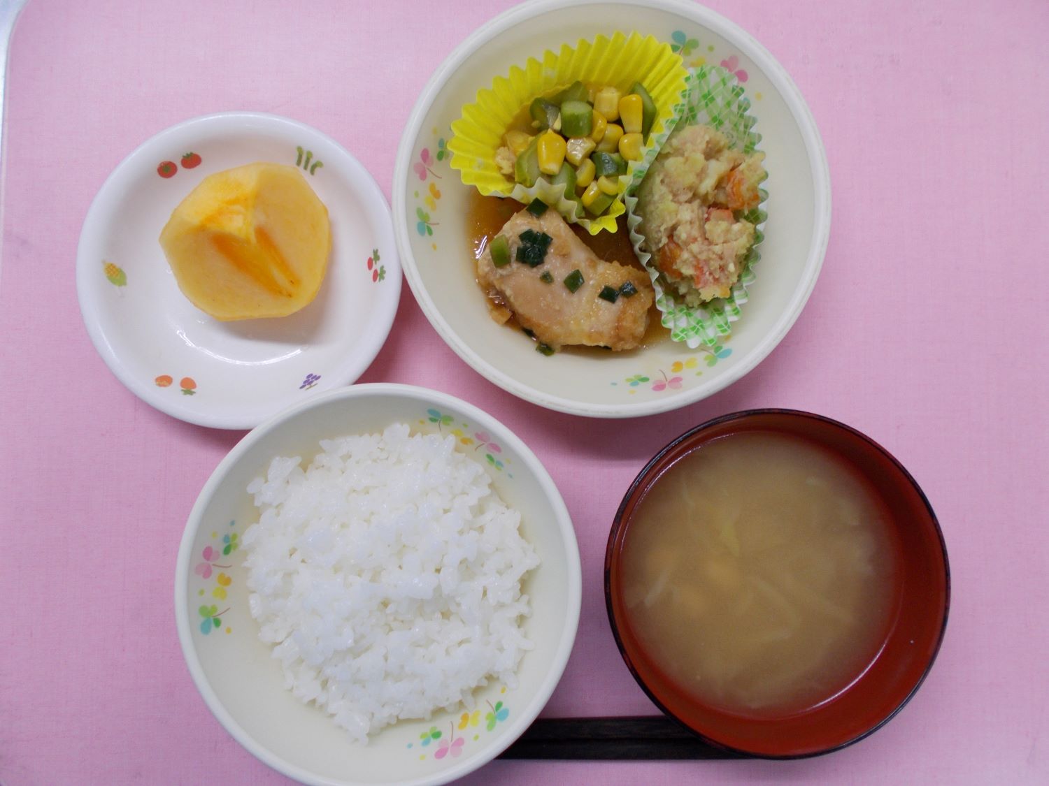 ホームきょうの給食 11/17 今日の給食 2023年11月17日 子どもたちが大好きな給食やおやつを毎日紹介しています! 【幼児食・乳児食】 昼食 ごはん みそ汁 油淋鶏 ほっこり白和え アスパラコーンソテー 柿 3時のおやつ 牛乳 小町麩スナック 10時のおやつ(乳児のみ) 牛乳