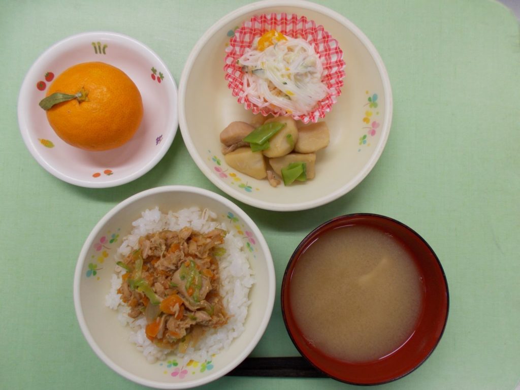 ホームきょうの給食 12/13 今日の給食 2023年12月14日 子どもたちが大好きな給食やおやつを毎日紹介しています! 【幼児食・乳児食】 昼食 ツナ麦丼 (乳:ツナ丼) みそ汁 鶏肉と里芋の煮物 春雨サラダ みかん 3時のおやつ 牛乳 こぎつねおにぎり ぬか漬け 10時のおやつ(乳児のみ) 野菜ジュース