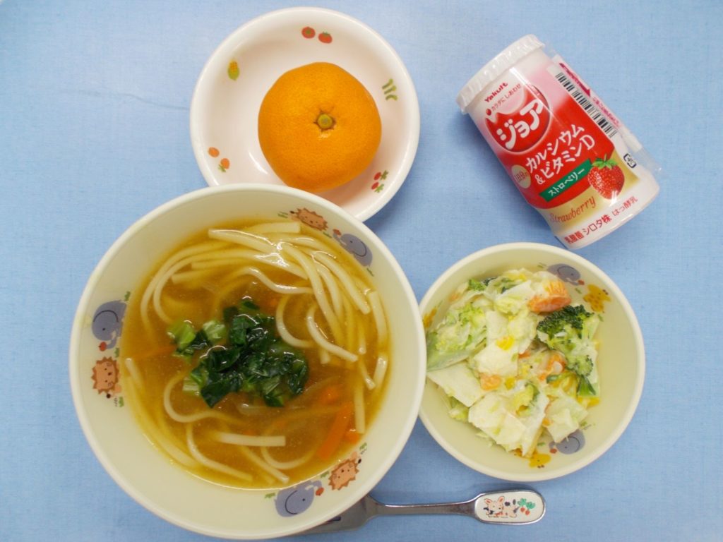 ホームきょうの給食 12/16 今日の給食 2023年12月16日 子どもたちが大好きな給食やおやつを毎日紹介しています! 【幼児食・乳児食】 昼食 鶏カレーうどん (乳児:かしわうどん) キャベツとりんごのサラダ ジョア みかん 3時のおやつ 麦茶 ゆかりおにぎり ぬか漬け 10時のおやつ(乳児のみ) 野菜ジュース