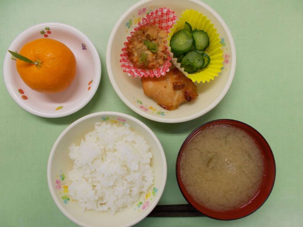 ホームきょうの給食 12/18 今日の給食 2023年12月18日 子どもたちが大好きな給食やおやつを毎日紹介しています! 【幼児食・乳児食】 昼食 ごはん みそ汁 からあげ 卯の花煮 胡瓜の塩もみ みかん 3時のおやつ 牛乳 そぼろおにぎり 食べる小魚 10時のおやつ(乳児のみ) 牛乳