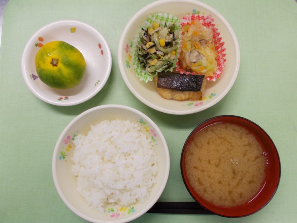 ホームきょうの給食 9/25 今日の給食 2023年9月8日2023年9月25日 子どもたちが大好きな給食やおやつを毎日紹介しています! 【幼児食・乳児食】 昼食 ごはん みそ汁 銀だらの照り焼き 野菜ソテー カルカルサラダ みかん 3時のおやつ 牛乳 ピーチゼリー おせんべい 10時のおやつ(乳児のみ) 牛乳