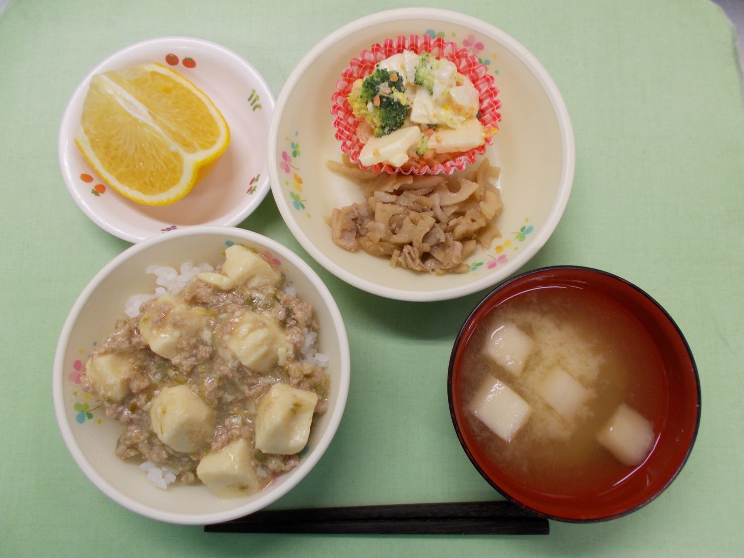 ホームきょうの給食 1/4 今日の給食 2024年1月4日 子どもたちが大好きな給食やおやつを毎日紹介しています! 【幼児食・乳児食】 昼食 マーボー麦丼(乳児:マーボー丼) みそ汁 豚肉れんこん キャベツとりんごのサラダ はっさく 3時のおやつ 牛乳 日の出かん クラッカー 10時のおやつ(乳児のみ) 野菜ジュース