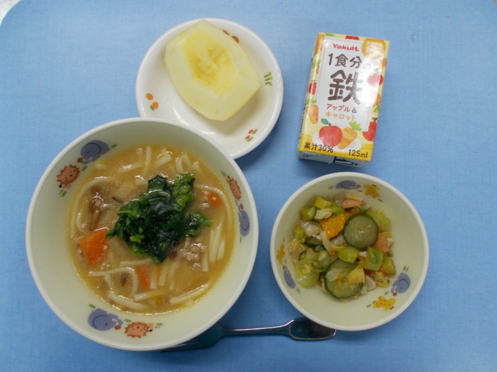 ホームきょうの給食 1/13 今日の給食 2024年1月13日 子どもたちが大好きな給食やおやつを毎日紹介しています! 【幼児食・乳児食】 昼食 ほうとう風うどん 白菜フレンチサラダ 野菜ジュース りんご 3時のおやつ 麦茶 昆布おにぎり ぬか漬け 10時のおやつ(乳児のみ) ジョア