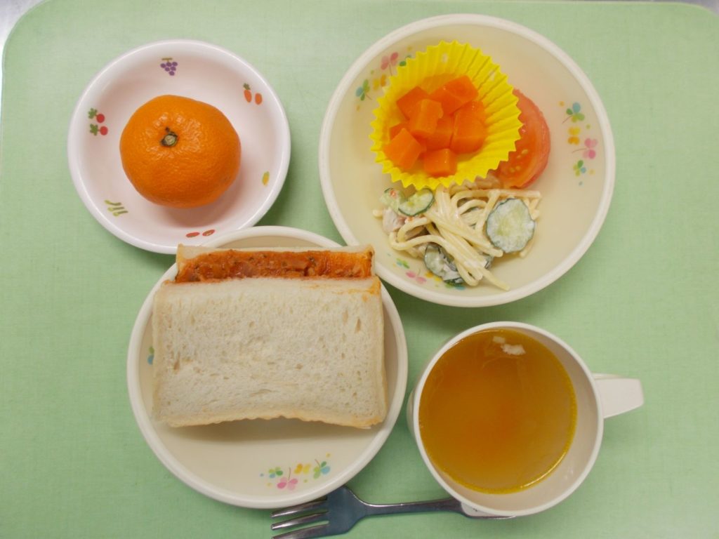 ホームきょうの給食 1/18 今日の給食 2024年1月18日 子どもたちが大好きな給食やおやつを毎日紹介しています! 【幼児食・乳児食】 昼食 ピザ風サンド コンソメスープ スパゲティサラダ 人参グラッセ みかん 3時のおやつ 牛乳 たくあんおにぎり ぬか漬け 10時のおやつ(乳児のみ) 野菜ジュース