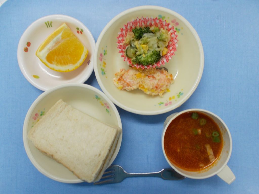 ホームきょうの給食 2/8 今日の給食 2024年2月8日 子どもたちが大好きな給食やおやつを毎日紹介しています! 【幼児食・乳児食】 昼食 バターサンド トマトスープ 魚のカラフル焼き ミックスサラダ はっさく 3時のおやつ 野菜ジュース 鮭茶漬け 10時のおやつ(乳児のみ) 牛乳
