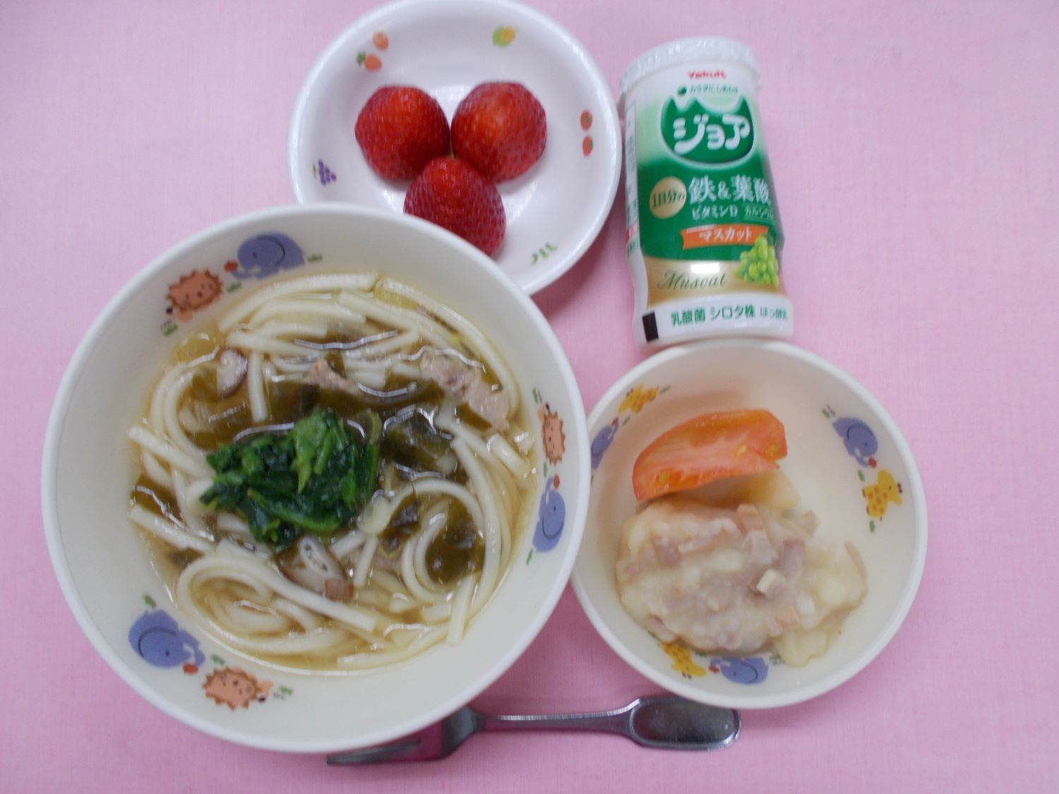 ホームきょうの給食 2/24今日の給食 2024年2月24日 子どもたちが大好きな給食やおやつを毎日紹介しています! 【幼児食・乳児食】 昼食 五目うどん 根菜ソテー トマト いちご ジョア 3時のおやつ 麦茶 鮭おにぎり ぬか漬け 10時のおやつ(乳児のみ) 野菜ジュース