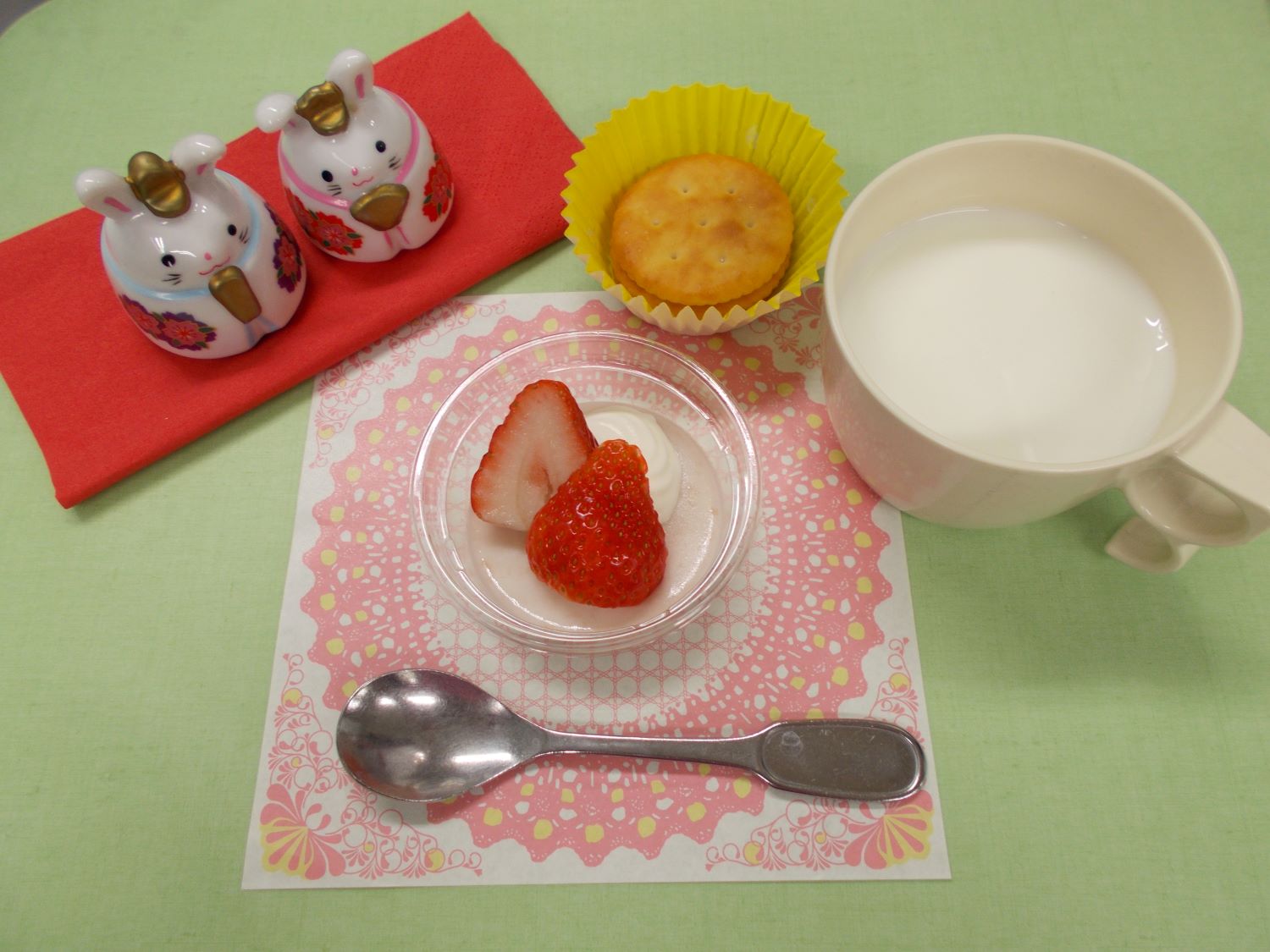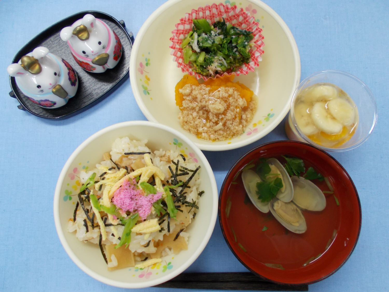 ホームきょうの給食 3/1 今日の給食 2024年3月1日 子どもたちが大好きな給食やおやつを毎日紹介しています! 【幼児食・乳児食】 昼食 五目ちらし寿司 (乳児:混ぜごはん) 潮汁 南瓜のそぼろあん 菜花のおかか和え フルーツポンチ ひな祭りメニューです♪ 3時のおやつ 牛乳 ひなババロア クラッカー 10時のおやつ(乳児のみ) 野菜ジュース