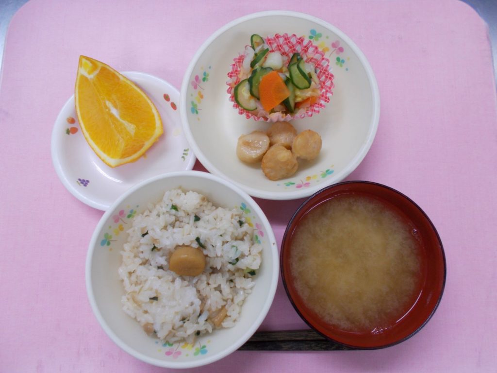 ホームきょうの給食 3/8 今日の給食 2024年3月8日 子どもたちが大好きな給食やおやつを毎日紹介しています! 【幼児食・乳児食】 昼食 ほたての炊き込みごはん みそ汁 ほたてのからあげ 塩もみ野菜 オレンジ 3時のおやつ 牛乳 小町麩ラスク 10時のおやつ(乳児のみ) ジョア
