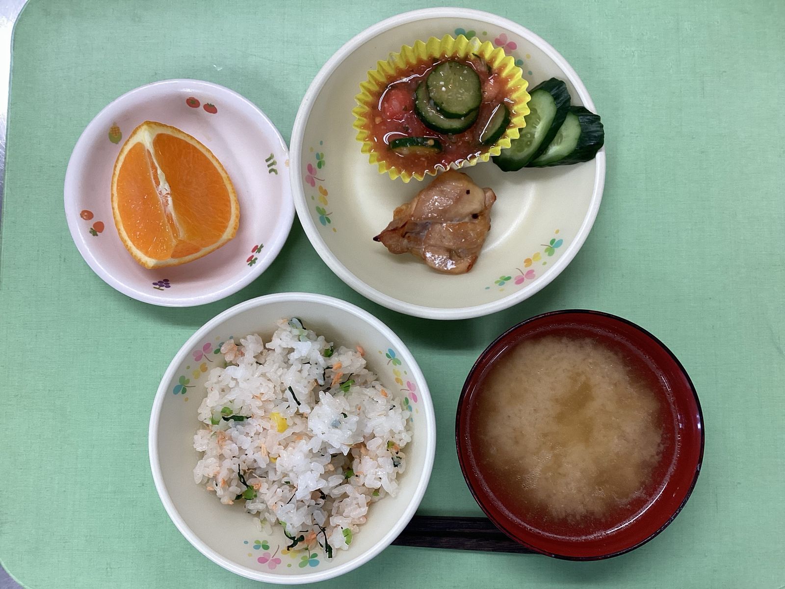 ホームきょうの給食 4/1 今日の給食 2024年4月1日 子どもたちが大好きな給食やおやつを毎日紹介しています! 【幼児食・乳児食】 昼食 お花畑ごはん みそ汁 鶏のくわ焼き トマトの塩こうじ和え ぬか漬け オレンジ 3時のおやつ コーンフレークミルクがけ 10時のおやつ(乳児のみ) 野菜ジュース