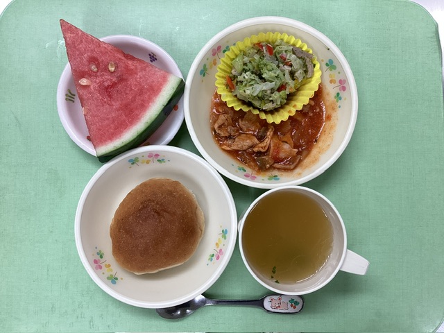 ホームきょうの給食 6/6 今日の給食 2024年6月6日 子どもたちが大好きな給食やおやつを毎日紹介しています! 【幼児食・乳児食】 昼食 もち粉パン オニオンスープ ポークチャップ ブロッコリーサラダ すいか 3時のおやつ 牛乳 こぎつねおにぎり ぬか漬け 10時のおやつ(乳児のみ) 牛乳