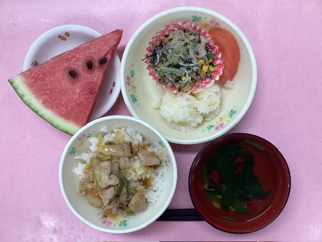 ホームきょうの給食 7/10 今日の給食 2024年7月10日 子どもたちが大好きな給食やおやつを毎日紹介しています! 【幼児食・乳児食】 昼食 中華丼 すまし汁 カルカルサラダ 粉ふき芋 トマト すいか 3時のおやつ 牛乳 ホットケーキ 10時のおやつ(乳児のみ) 牛乳