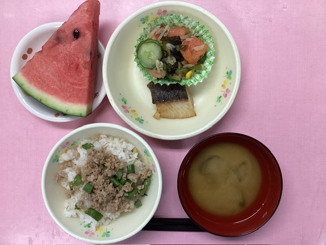 ホームきょうの給食 7/17 今日の給食 2024年7月17日 子どもたちが大好きな給食やおやつを毎日紹介しています! 【幼児食・乳児食】 昼食 しぐれ麦丼 (乳:しぐれ丼) みそ汁 銀だらの照り焼き 和風サラダ すいか 3時のおやつ 牛乳 信玄マカロニ 10時のおやつ(乳児のみ) ジョア