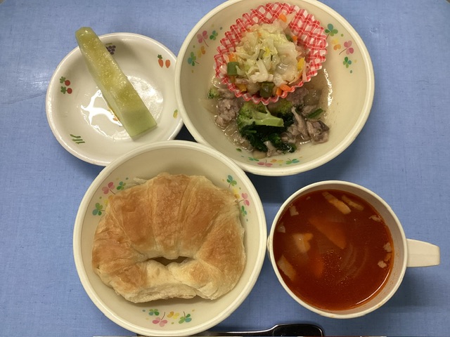 ホームきょうの給食 7/18 今日の給食 2024年7月18日 子どもたちが大好きな給食やおやつを毎日紹介しています! 【幼児食・乳児食】 昼食 クロワッサン ミネストローネ 豚肉の洋風煮込み キャベツサラダ メロン 3時のおやつ ジョア お茶漬け 10時のおやつ(乳児のみ) 牛乳