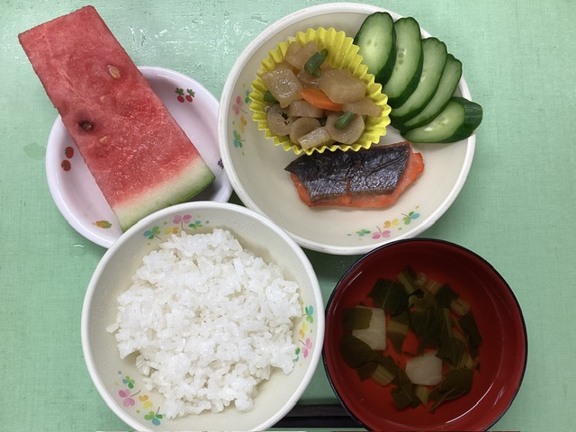 ホームきょうの給食 7/19 今日の給食 2024年7月19日 子どもたちが大好きな給食やおやつを毎日紹介しています! 【幼児食・乳児食】 昼食 ごはん (ち:飯盒炊爨) すまし汁 焼き魚 根菜炒め煮 ぬか漬け すいか(すいか割り) 3時のおやつ 牛乳 ベイクドパン 10時のおやつ(乳児のみ) 牛乳