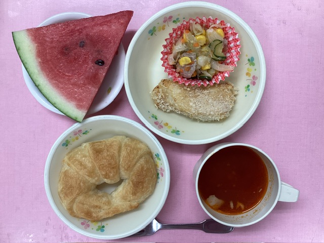 ホームきょうの給食 8/22 今日の給食 2024年8月22日 子どもたちが大好きな給食やおやつを毎日紹介しています! 【幼児食・乳児食】 昼食 クロワッサン トマトスープ かれいのパン粉焼き ポークサラダ すいか 3時のおやつ 野菜ジュース みそ雑炊 10時のおやつ(乳児のみ) 牛乳