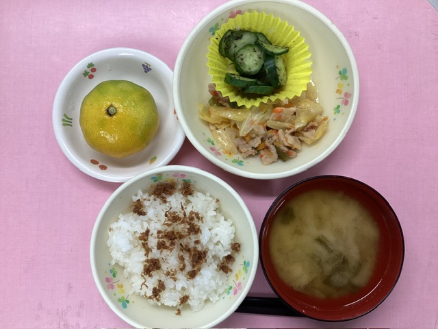 ホームきょうの給食 9/2 今日の給食 2024年9月2日 子どもたちが大好きな給食やおやつを毎日紹介しています! 【幼児食・乳児食】 昼食 おかかごはん みそ汁 ホイコーロー きゅうりのゆかり和え みかん 3時のおやつ 野菜ジュース にゅうめん 10時のおやつ(乳児のみ) 牛乳
