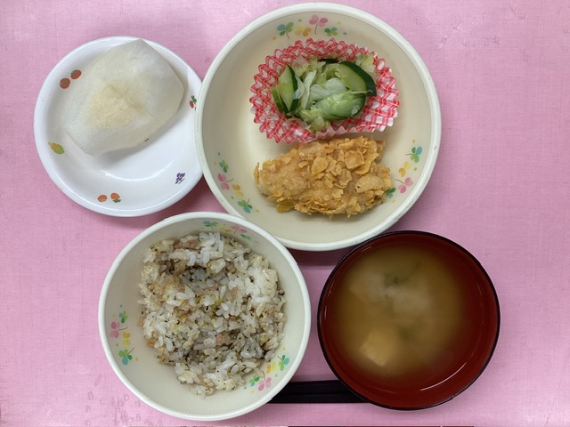 ホームきょうの給食 9/6 今日の給食 2024年9月6日 子どもたちが大好きな給食やおやつを毎日紹介しています! 【幼児食・乳児食】 昼食 えのきの混ぜきびごはん みそ汁 かじきのコーンフレーク焼き 手もみ野菜 梨 3時のおやつ 牛乳 ピーチゼリー おせんべい 10時のおやつ(乳児のみ) ジョア