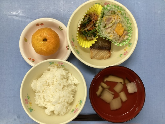 ホームきょうの給食 9/10 今日の給食 2024年9月10日 子どもたちが大好きな給食やおやつを毎日紹介しています! 【幼児食・乳児食】 昼食 ごはん すまし汁 銀だらの西京焼き バンサンスー 三色おかか和え みかん 3時のおやつ 牛乳 たくあんごはん ぬか漬け 10時のおやつ(乳児のみ) 牛乳