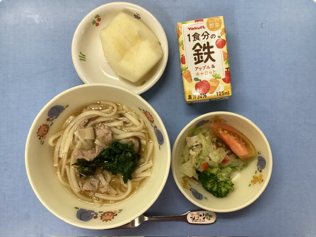 ホームきょうの給食 9/28 今日の給食 2024年9月28日 子どもたちが大好きな給食やおやつを毎日紹介しています! 【幼児食・乳児食】 昼食 五目うどん ブロッコリーサラダ トマト りんご 野菜ジュース 3時のおやつ 麦茶 夕焼けおにぎり 食べる小魚 10時のおやつ(乳児のみ) ジョア