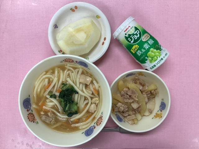 ホームきょうの給食 10/5 今日の給食 2024年10月5日 子どもたちが大好きな給食やおやつを毎日紹介しています! 【幼児食・乳児食】 昼食 鶏カレーうどん (乳:かしわうどん) 根菜ソテー ジョア りんご 3時のおやつ 麦茶 一口きなこおにぎり ぬか漬け 10時のおやつ(乳児のみ) 野菜ジュース