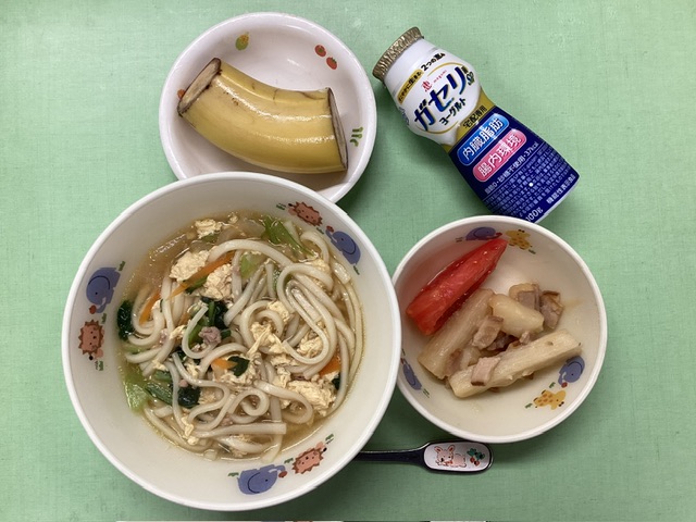 ホームきょうの給食 11/2 今日の給食 2024年11月2日 子どもたちが大好きな給食やおやつを毎日紹介しています! 【幼児食・乳児食】 昼食 卵うどん 根菜ソテー トマト 飲むヨーグルト バナナ ※ジョア→飲むヨーグルトに変更になりました。 3時のおやつ 麦茶 ツナマヨおにぎり 食べる小魚 10時のおやつ(乳児のみ) 野菜ジュース