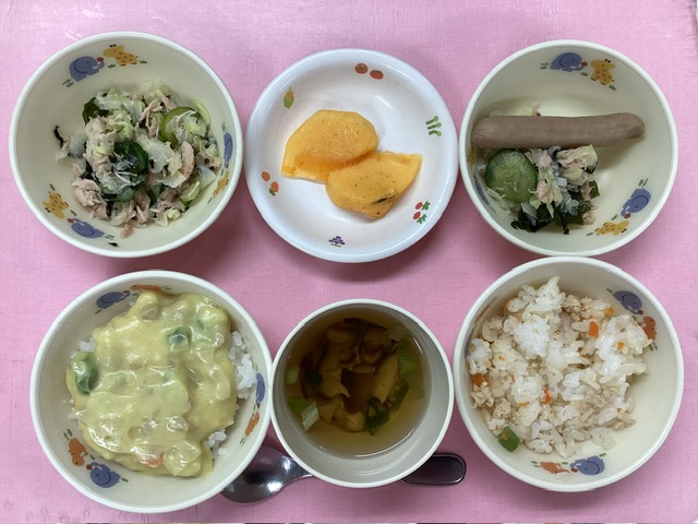 ホームきょうの給食 11/20 今日の給食 2024年11月20日 子どもたちが大好きな給食やおやつを毎日紹介しています! 【幼児食・乳児食】 昼食 カレー雑穀ライス (きんぎょ・めだか組 : チキンライス&ウインナー) すまし汁 シーフードサラダ 柿 3時のおやつ 牛乳 あげパン 10時のおやつ(乳児のみ) 牛乳