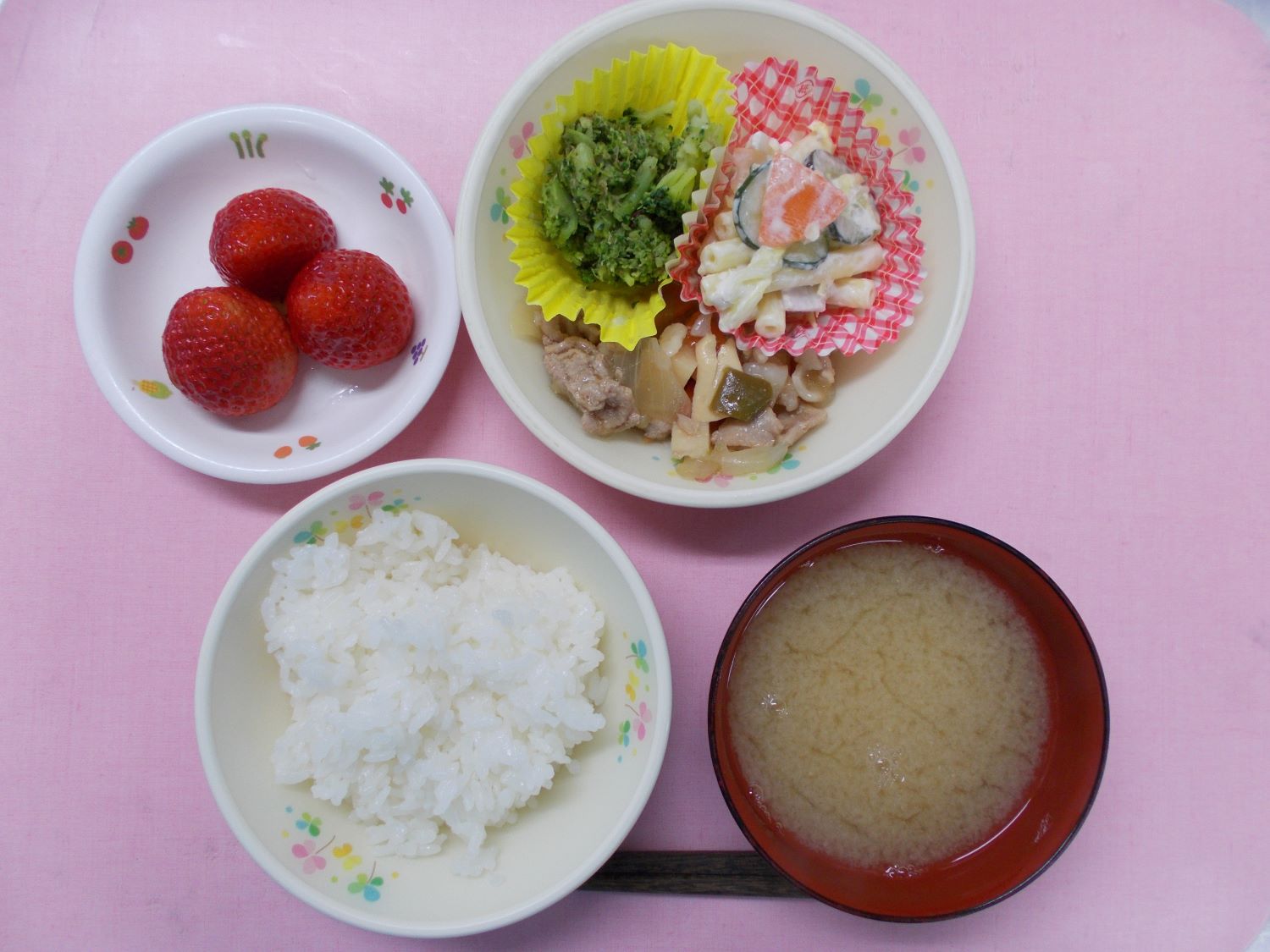 ホームきょうの給食 3/5 今日の給食 2024年3月5日 子どもたちが大好きな給食やおやつを毎日紹介しています! 【幼児食・乳児食】 昼食 ごはん みそ汁 酢豚 ブロッコリーの和え物 マカロニサラダ いちご 3時のおやつ 牛乳 そぼろおにぎり ぬか漬け 10時のおやつ(乳児のみ) 牛乳