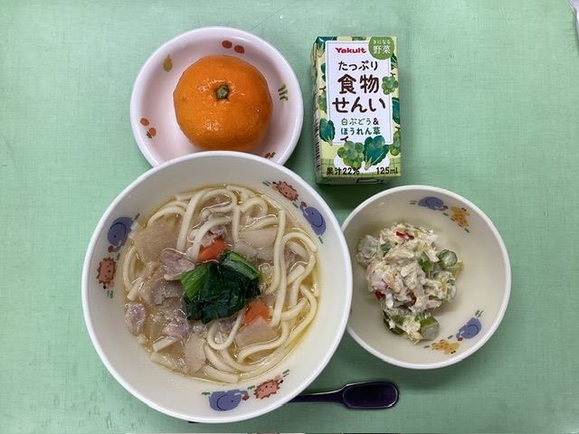 ホームきょうの給食 2/1 今日の給食 2025年2月1日 子どもたちが大好きな給食やおやつを毎日紹介しています! 【幼児食・乳児食】 昼食 とん汁うどん ツナサラダ 野菜ジュース みかん 3時のおやつ 麦茶 カラフルおにぎり ぬか漬け 10時のおやつ(乳児のみ) ジョア