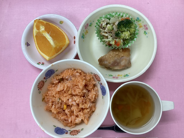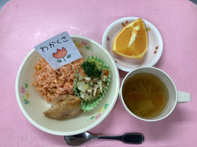 ホームきょうの給食 2/21 今日の給食 2025年2月21日2025年2月22日 子どもたちが大好きな給食やおやつを毎日紹介しています! 【幼児食・乳児食】 昼食 チキンライス ベジタブルスープ からあげ 冬のカラフルサラダ オレンジ (年長組にはプレゼントメニューで お名前の旗が立ちました!) 3時のおやつ ジョア にゅうめん 10時のおやつ(乳児のみ) 牛乳