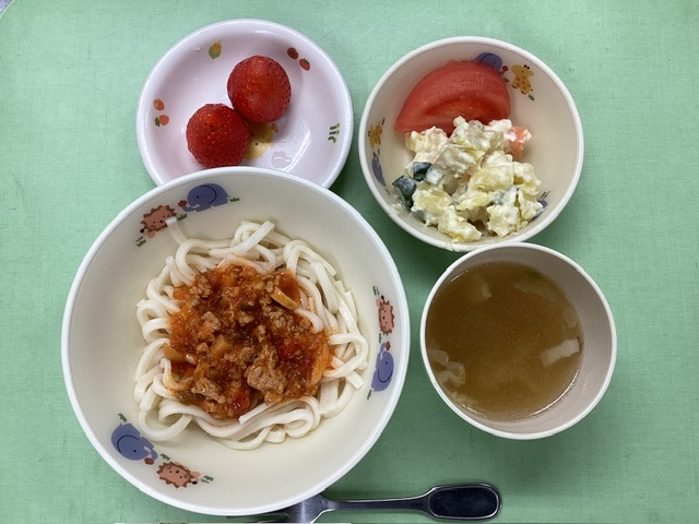 ホームきょうの給食 3/15 今日の給食 2025年3月15日 子どもたちが大好きな給食やおやつを毎日紹介しています! 【幼児食・乳児食】 昼食 ミートソース ベーコンスープ さつまいものマセドアン トマト いちご 3時のおやつ 麦茶 ふりかけおにぎり 10時のおやつ(乳児のみ) ジョア