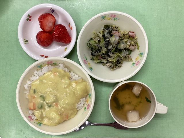 ホームきょうの給食 3/19 今日の給食 2025年3月19日 子どもたちが大好きな給食やおやつを毎日紹介しています! 【幼児食・乳児食】 昼食 カレー麦ライス (つくし組:カレーライス) (めだかきんぎょ組:チキンピラフと ウインナー) すまし汁 シーフードサラダ いちご 3時のおやつ 牛乳 焼き芋 10時のおやつ(乳児のみ) 牛乳