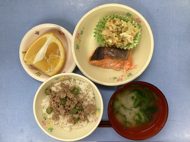 ホームきょうの給食 4/4 今日の給食 2025年4月4日 子どもたちが大好きな給食やおやつを毎日紹介しています! 【幼児食・乳児食】 昼食 しぐれ麦丼(乳:しぐれ丼) みそ汁 鮭の塩こうじ焼き 豆腐サラダ 甘夏 3時のおやつ 牛乳 餃子の皮ピザ 10時のおやつ(乳児のみ) ジョア