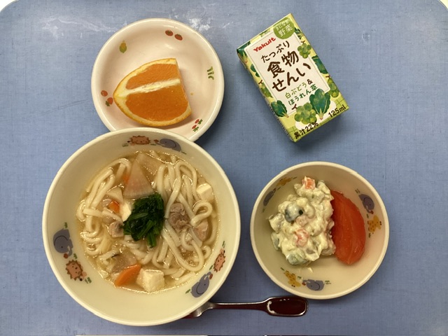 ホームきょうの給食 4/19 今日の給食 2025年4月19日 子どもたちが大好きな給食やおやつを毎日紹介しています! 【幼児食・乳児食】 昼食 けんちんうどん さつまいものマセドアン トマト 野菜ジュース オレンジ 3時のおやつ 麦茶 ツナマヨおにぎり ぬか漬け 10時のおやつ(乳児のみ) ジョア