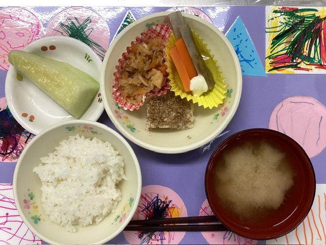ホームきょうの給食 6/18 今日の給食 2025年6月18日 子どもたちが大好きな給食やおやつを毎日紹介しています! 【幼児食・乳児食】 昼食 ごはん みそ汁 松風焼き 切り干し大根の煮付け 根菜スティック メロン 3時のおやつ 牛乳 ちんすこう 10時のおやつ(乳児のみ) 牛乳