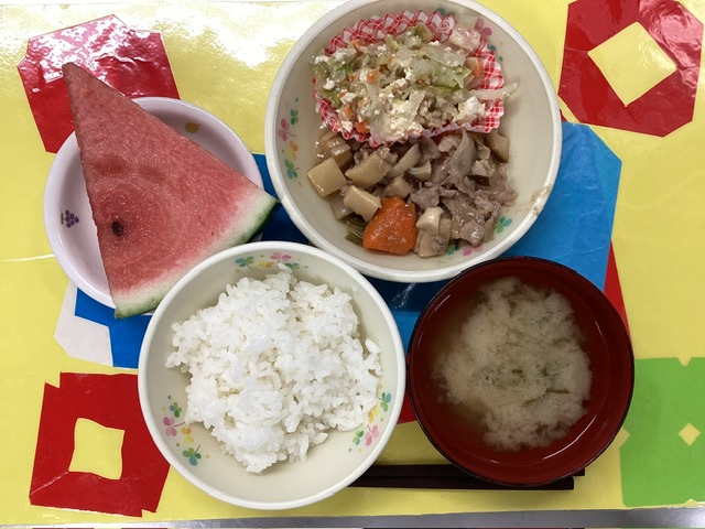 ホームきょうの給食 7/8今日の給食 2025年7月8日 子どもたちが大好きな給食やおやつを毎日紹介しています! 【幼児食・乳児食】 昼食 ごはん みそ汁 酢豚 豆腐サラダ スイカ 3時のおやつ 牛乳 枝豆おにぎり スティック人参 10時のおやつ(乳児のみ) ジョア
