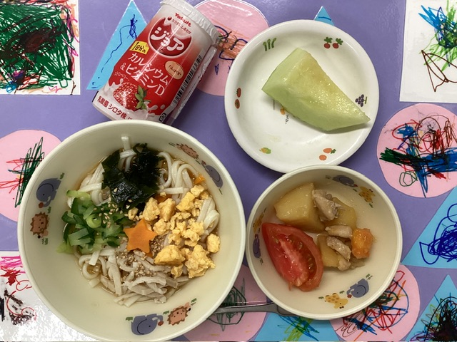 ホームきょうの給食 7/12 今日の給食 2025年7月12日 子どもたちが大好きな給食やおやつを毎日紹介しています! 【幼児食・乳児食】 昼食 冷やしうどん 煮物 トマト ジョア メロン 3時のおやつ 麦茶 みそおじや 10時のおやつ(乳児のみ) 野菜ジュース