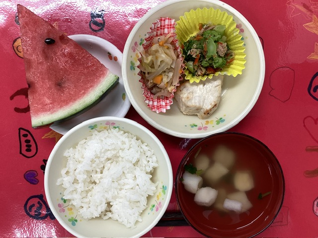 ホームきょうの給食 8/4 今日の給食 2025年8月4日 子どもたちが大好きな給食やおやつを毎日紹介しています! 【幼児食・乳児食】 昼食 ごはん すまし汁 魚のみそマヨドレ焼き ブロッコリーのツナ和え 野菜ソテー すいか 3時のおやつ 牛乳 あげパン 10時のおやつ(乳児のみ) ジョア
