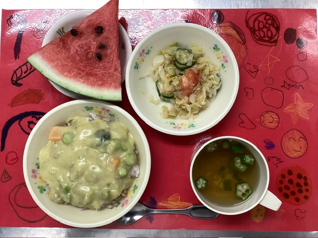 ホームきょうの給食 8/7 今日の給食 2025年8月7日 子どもたちが大好きな給食やおやつを毎日紹介しています! 【幼児食・乳児食】 昼食 夏野菜カレー雑穀ライス (つ:夏野菜カレーライス) (き:ツナピラフ&ウインナー) すまし汁 コンビネーションサラダ すいか 3時のおやつ コーンフレークミルクがけ 10時のおやつ(乳児のみ) 野菜ジュース