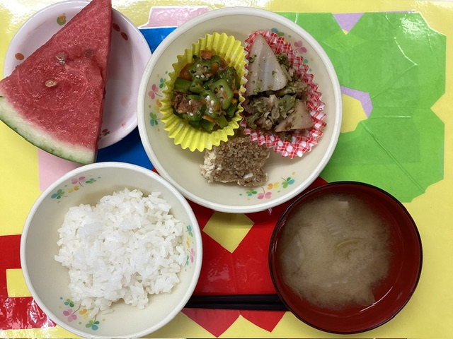 ホームきょうの給食 8/8 今日の給食 2025年8月8日 子どもたちが大好きな給食やおやつを毎日紹介しています! 【幼児食・乳児食】 昼食 ごはん みそ汁 松風焼き れんこんとブロッコリーのかむかむ炒め おくらのおひたし すいか 3時のおやつ 牛乳 野沢菜ごはん 食べる小魚 10時のおやつ(乳児のみ) ジョア
