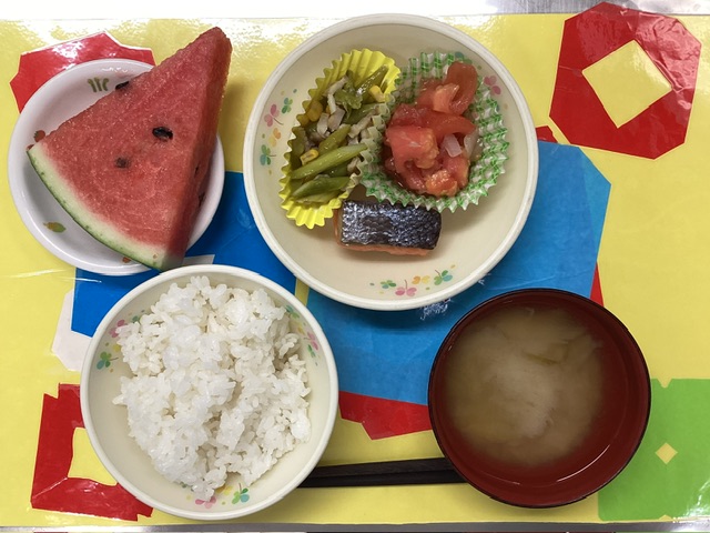 ホームきょうの給食 8/19 今日の給食 2025年8月19日2025年8月20日 子どもたちが大好きな給食やおやつを毎日紹介しています! 【幼児食・乳児食】 昼食 ごはん みそ汁 焼き魚 アスパラベーコンソテー トマトサラダ スイカ 3時のおやつ 牛乳 バナナトースト 10時のおやつ(乳児のみ) 牛乳