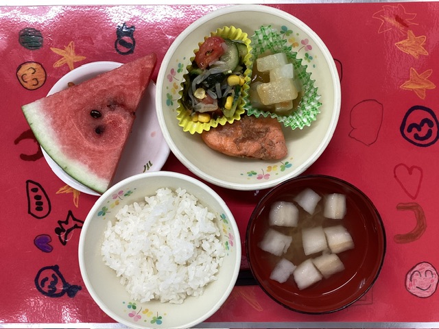 ホームきょうの給食 8/25 今日の給食 2025年8月25日 子どもたちが大好きな給食やおやつを毎日紹介しています! 【幼児食・乳児食】 昼食 ごはん すまし汁 鮭のうめ焼き ふろふき大根 和風サラダ すいか 3時のおやつ ジョア チキンフォー 10時のおやつ(乳児のみ) 牛乳