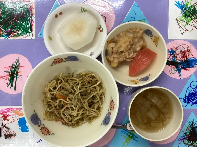 ホームきょうの給食 8/30 今日の給食 2025年8月30日 子どもたちが大好きな給食やおやつを毎日紹介しています! 【幼児食・乳児食】 昼食 焼きそば(乳 : 焼きうどん) 白菜のとろみスープ 根菜ソテー トマト 梨 3時のおやつ 麦茶 磯の香おにぎり ぬか漬け 10時のおやつ(乳児のみ) ジョア