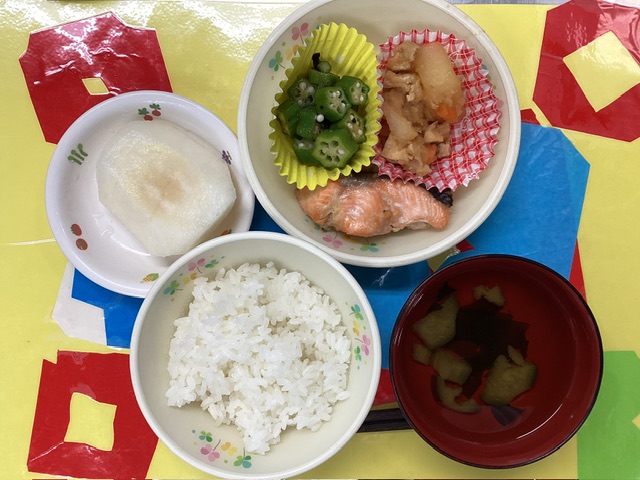 ホームきょうの給食 9/2 今日の給食 2025年9月2日 子どもたちが大好きな給食やおやつを毎日紹介しています! 【幼児食・乳児食】 昼食 ごはん すまし汁 鮭のねぎみそ焼き ポテトと人参の煮物 おくらののり和え 梨 3時のおやつ 野菜ジュース みそおじや 10時のおやつ(乳児のみ) 牛乳