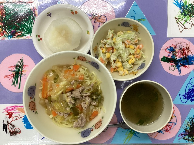 ホームきょうの給食 9/13 今日の給食 2025年9月13日 子どもたちが大好きな給食やおやつを毎日紹介しています! 【幼児食・乳児食】 昼食 あんかけ焼きそば (乳:あんかけうどん) きのこスープ コールスローサラダ 梨 3時のおやつ 野菜ジュース トマトリゾット 10時のおやつ(乳児のみ) ジョア
