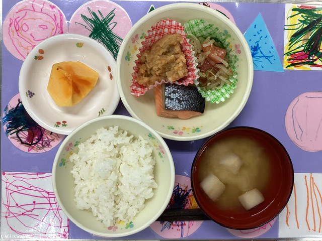 ホームきょうの給食 9/24 今日の給食 2025年9月24日 子どもたちが大好きな給食やおやつを毎日紹介しています! 【幼児食・乳児食】 昼食 ごはん みそ汁 焼き魚 卯の花煮 和風サラダ 柿 3時のおやつ 牛乳 ブルーベリージャムサンド 10時のおやつ(乳児のみ) 野菜ジュース