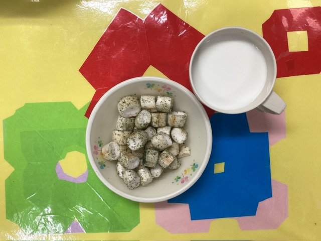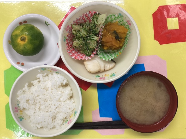 ホームきょうの給食 10/3 今日の給食 2025年10月3日 子どもたちが大好きな給食やおやつを毎日紹介しています! 【幼児食・乳児食】 昼食 ごはん 豚汁 たらの煮つけ ブロッコリーのごま和え 南瓜の甘煮 みかん 3時のおやつ 牛乳 小町麩ラスク(のりしお) 10時のおやつ(乳児のみ) ジョア